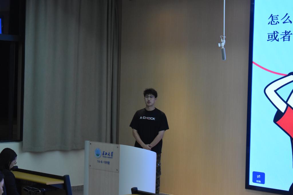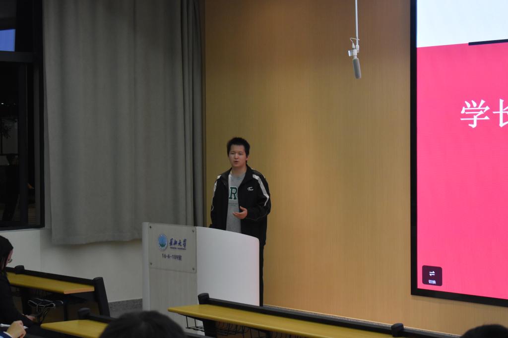 随后,获国家级学科竞赛七项奖项的张义勇学长为大家分享经验。他结合自己在比赛中的亲身经历,鼓励大家敢闯敢创,从校级大学生创新创业项目起步,逐步提升自己的能力,进而挑战更高层次的赛事。张义勇学长强调要合理地选择想要参加的竞赛并科学地规划备赛时间,从而有效提升备赛效率。