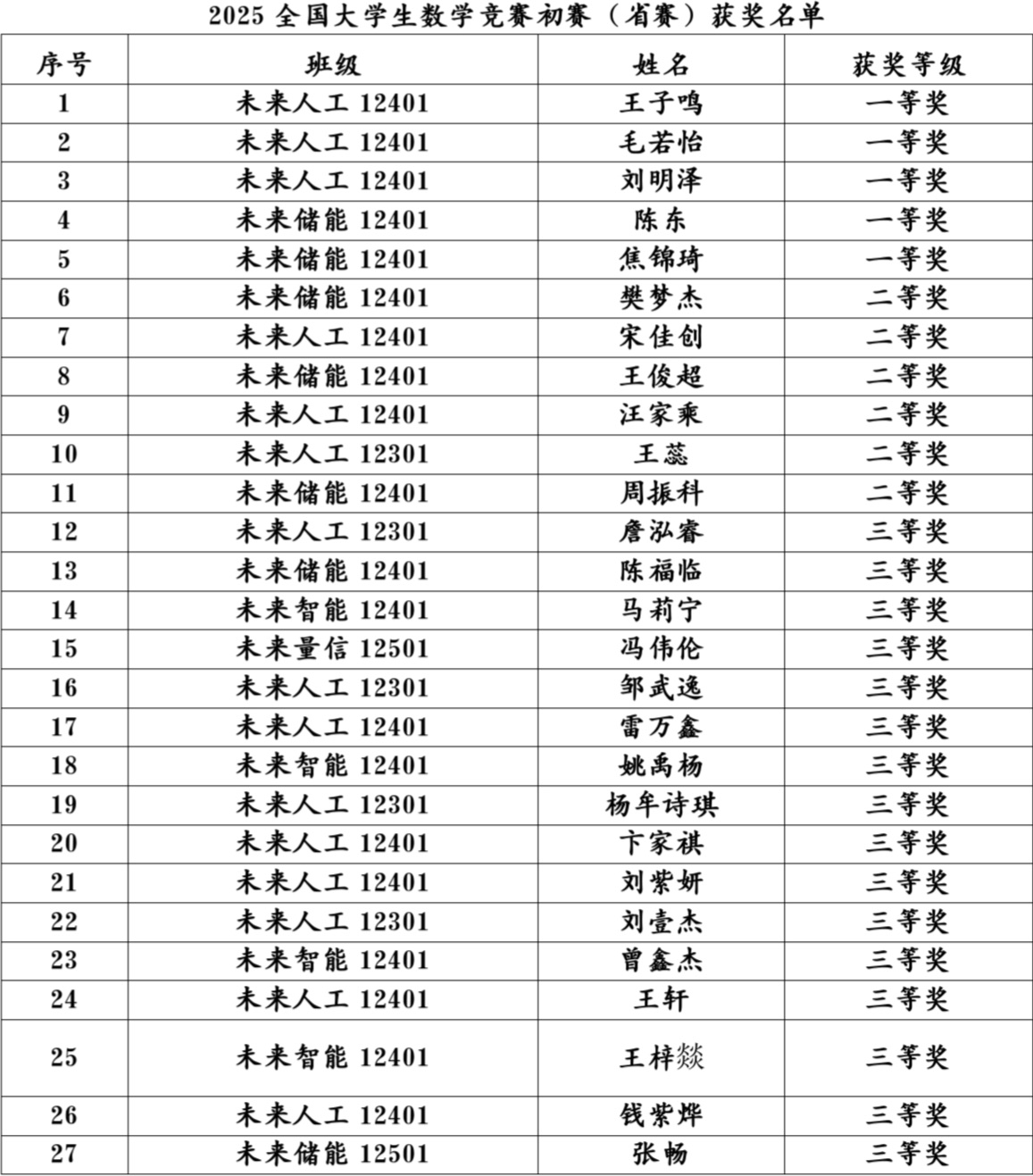 (通讯员 陆涵 向云彬)近日,2025年第十届全国大学生数学竞赛湖北区竞赛暨第十四届湖北省大学生数学竞赛初赛成绩公布,我院共有27名同学获奖,其中一等奖5人、二等奖6人、三等奖16人。未来人工12401班王子鸣同学以76.5分的全校最高分成功晋级全国决赛。本次省赛吸引全省2万余人参加,仅24人获得国赛资格,王子鸣是我校唯一入围选手。