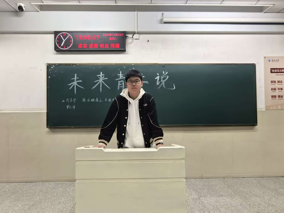 (通讯员 黄晓宇/文 魏静萱/摄)10月28日晚17:50,长江大学未来技术学院12501班本学期第五期“未来少年说”主题微演讲活动。本次活动以“绿水映青山,共筑生态梦”为核心议题,由代丰华同学担任主讲,班级全体同学参与,在深秋夜色中展开了一场关于生态保护的对话