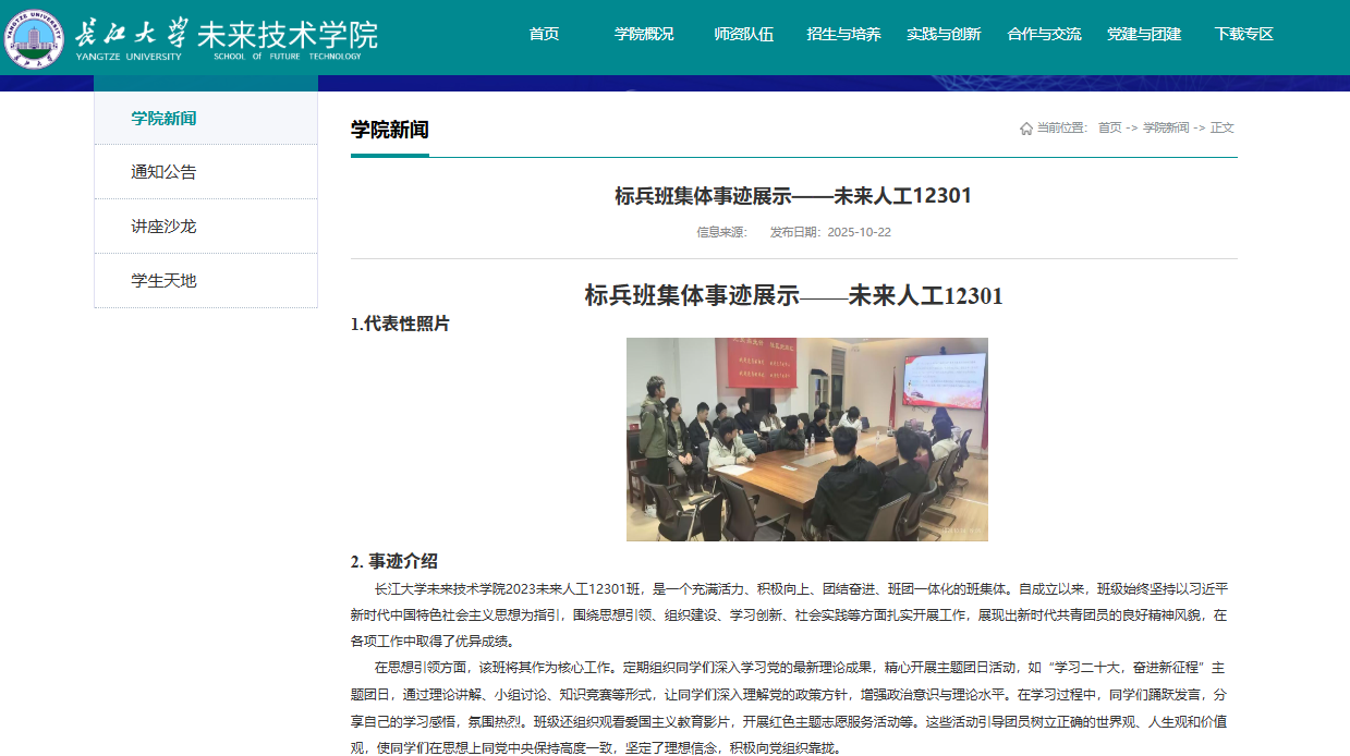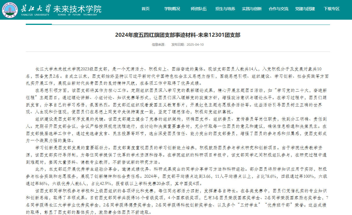 未来技术学院2023级团支部自成立以来,在校团委和学院团委的坚强领导与悉心指导下,始终坚持以习近平新时代中国特色社会主义思想为指引,牢牢把握立德树人根本任务,聚焦新时代青年成长成才需求,构建起以思想引领为核心、组织建设为保障、学风建设为重点、创新实践为驱动的系统化发展路径。团支部不断推进工作机制规范化、活动开展品牌化、育人模式特色化,在实践中探索形成了“理论学习有深度、组织运行有力度、学风建设有温度、创新发展有广度”的工作格局。通过持续强化政治引领与价值塑造,全面激发团员内生动力与集体凝聚力,逐步打造出一支理想信念坚定、纪律作风严明、学习氛围浓厚、综合素质突出的先进团支部,展现出新时代高校基层团组织蓬勃向上的青春风貌与示范引领作用。